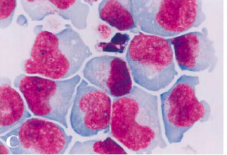 This picture shows NK cells from the blood smear of a patient with NK-cell lymphoma whose cells were harvested and used to establish the NK-92 cell line which is now used worldwide for cancer research and treatment (Cover of BLOOD Febr 1st, 1997, Vol. 89). The purple represents the nucleus of the cells which contains all the genetic information. The light blue area shows the cytoplasma with numerous vacuoles that contain all the effector molecules (perforin, granzymes, cytokines) that kill cancer cells.