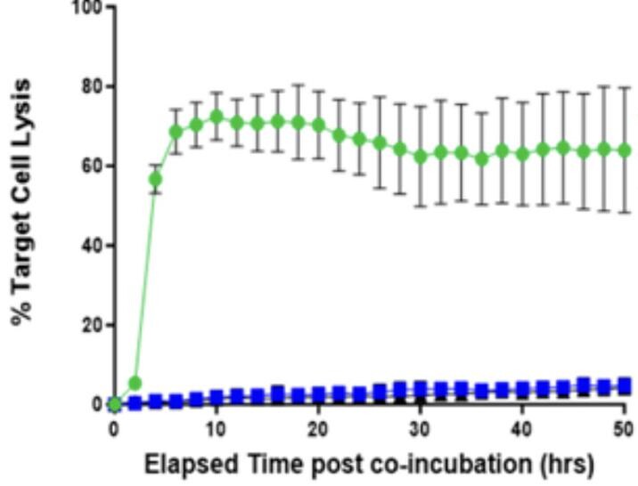 This graph shows the killing of OSCA-40 dog osteosarcoma cells by NK Bio-Extract (green line). Even after a short – 30 minute – exposure of the cancer cells to the NK-92 Bio-Extract, over 80% of the OSCA-40 cancer cells are killed (compared to Medium control) (blue line) and the OSCA-40 cells are not growing back over the following 2-3 days [Cellular Immunology 413 (2025) 10495]